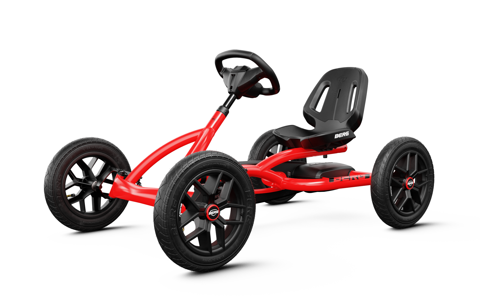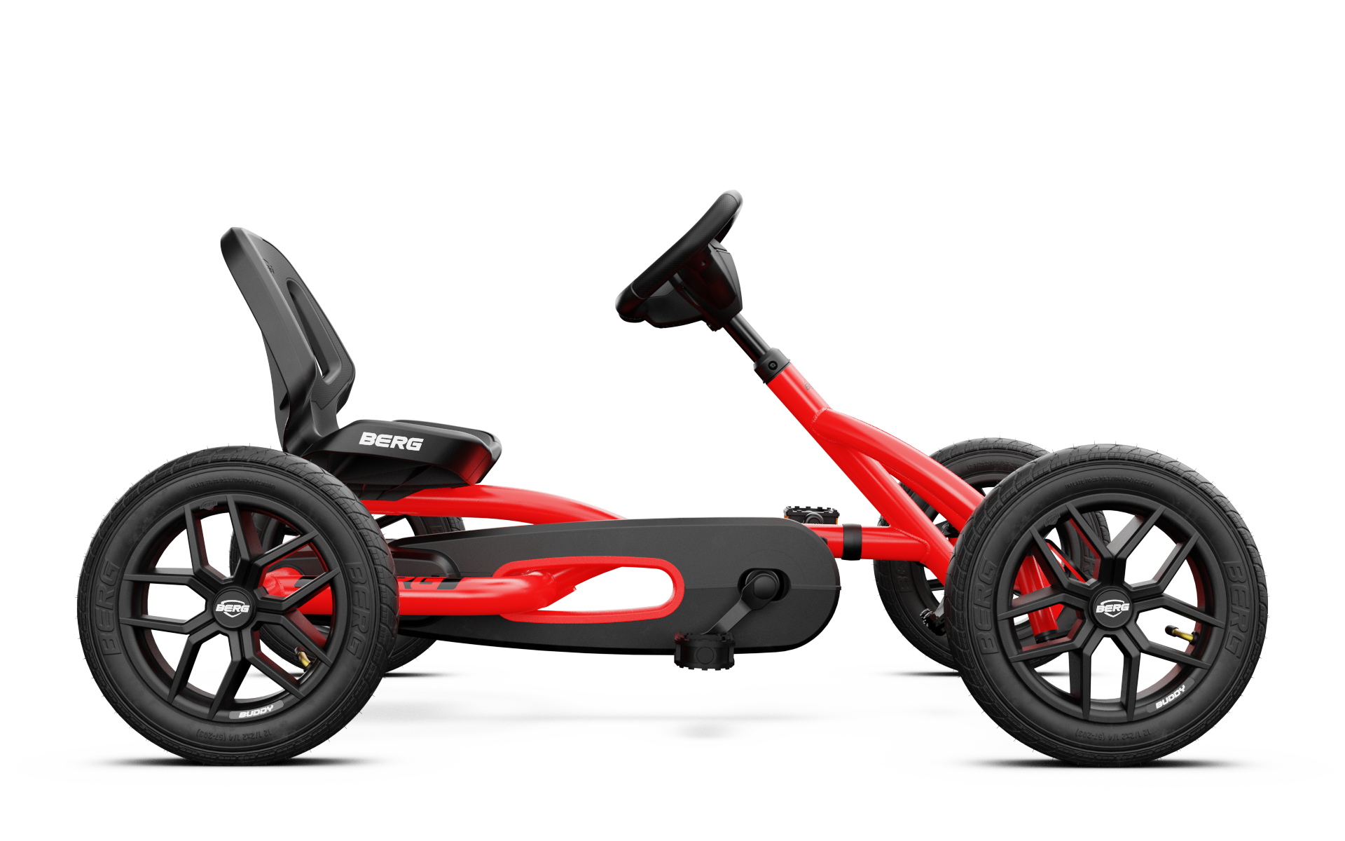 BERG Buddy go-karten er udstyret med luftdæk. Luftdæk har lavere rullemodstand end massive dæk, hvilket gør kørslen mere komfortabel og lettere. De giver også en hurtigere og mere jævn kørsel, samtidig med at sikkerheden opretholdes.